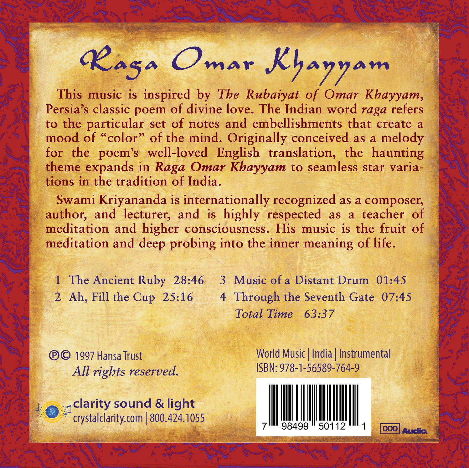 This music is inspired by The Rubaiyat of Omar Khayyam, Persia's classic poem of divine love. The Indian word "raga" refers to the particular set of notes and embellishments that create a mood or "color" of the mind.