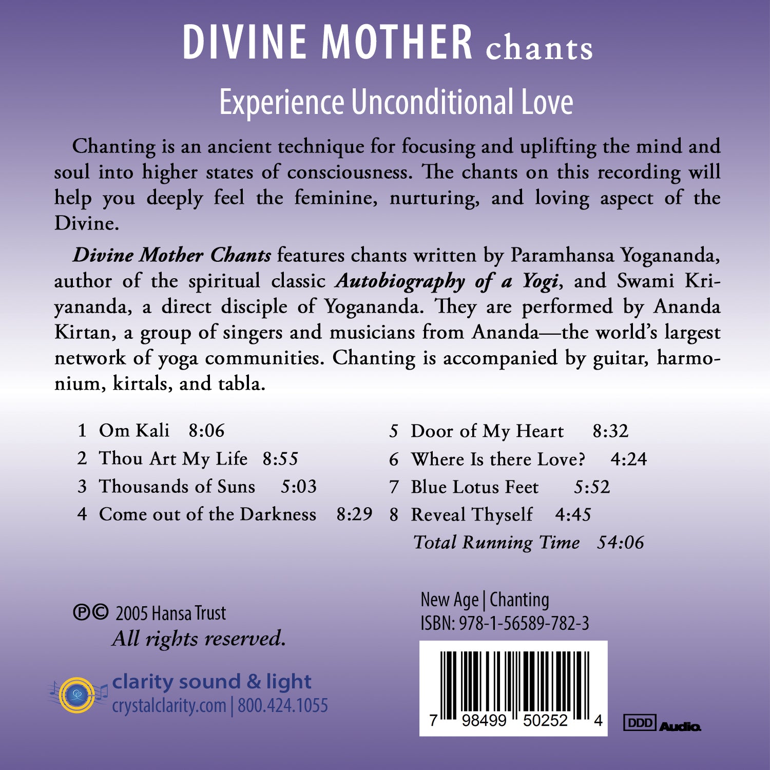 Divine Mother Chants features chants written by Paramhansa Yogananda, author of the spiritual classic Autobiography of a Yogi, and Swami Kriyananda, a direct disciple of Yogananda. They are performed by Ananda Kirtan, a group of singers and musicians from Ananda—the world’s largest network of yoga communities. Chanting is accompanied by guitar, harmonium, kirtals, and tabla.